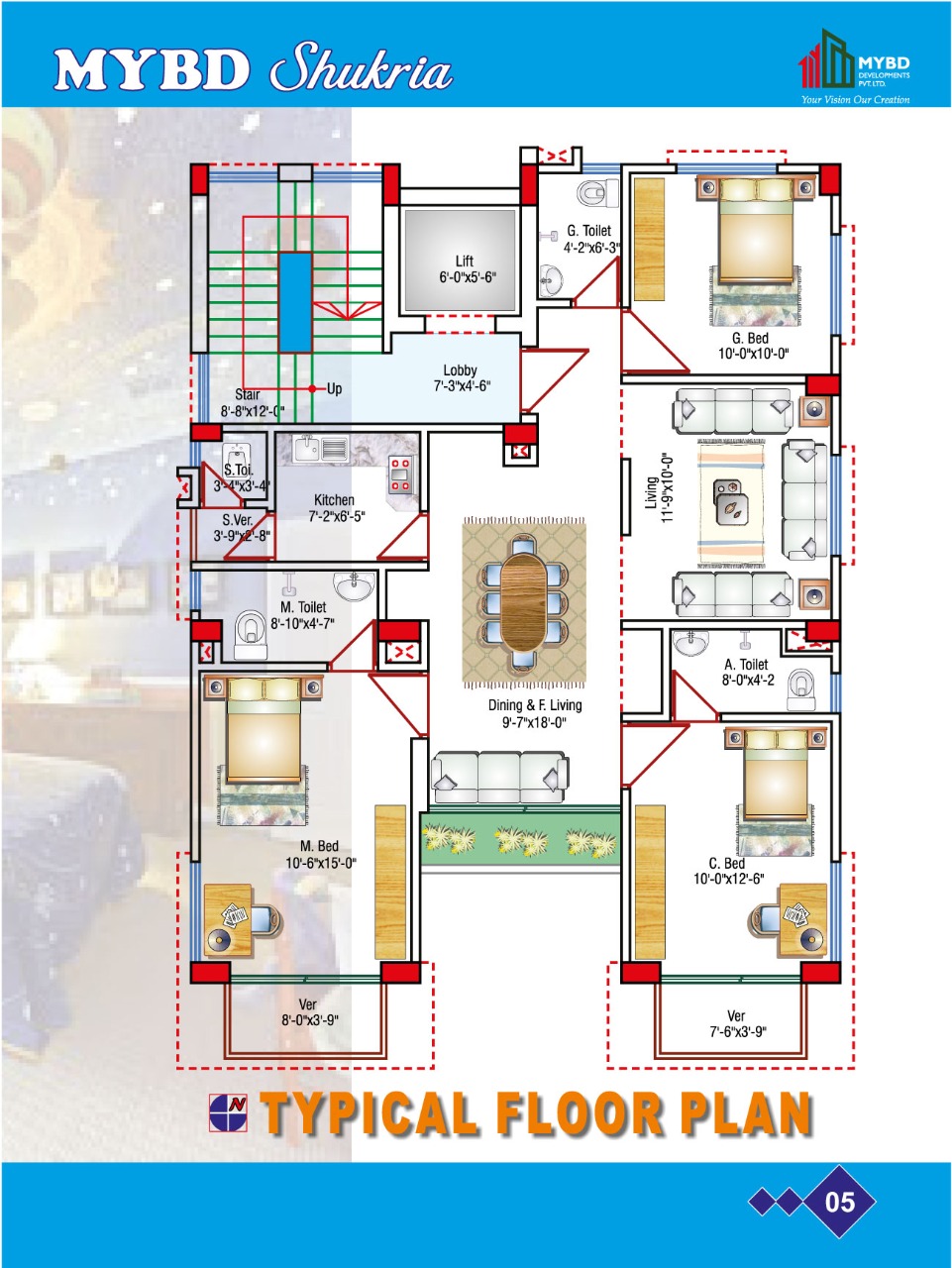 MYBD SHUKRIA is a Seven (G + 6 ) = 07 storied residential project distinctively designed by highly qualified and experienced architect, engineers and professionals with most care to provide privacy, comfort, security and healthy surrounding to each apartment. When you are exhausted with traffic jam, inhabitable environment, pollution, MYBD DEVELOPMENTS PVT. LTD. will ensure your living in a modern house with sound environment at affordable price.